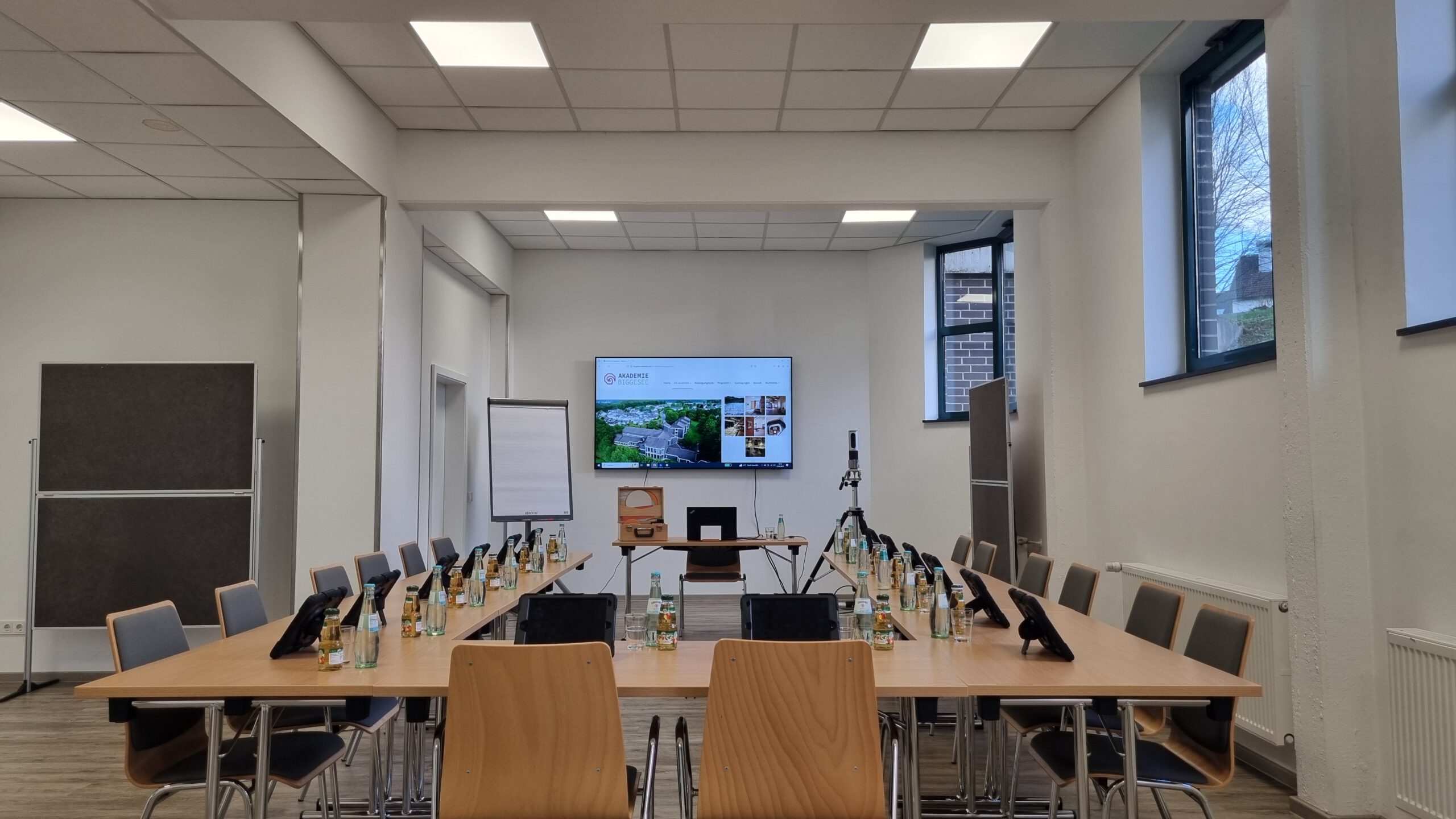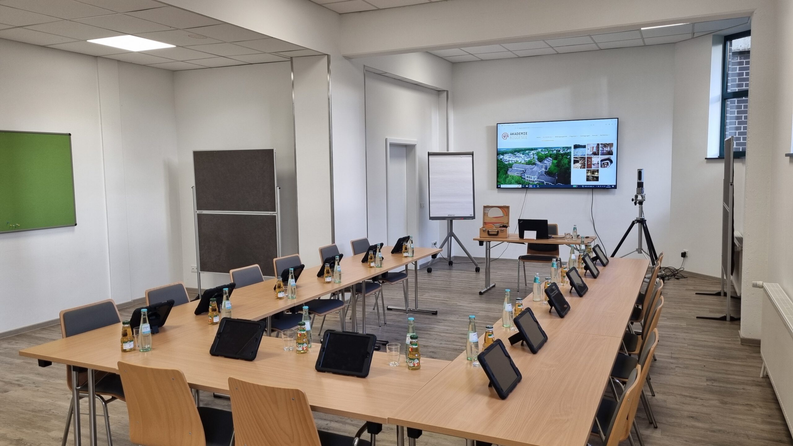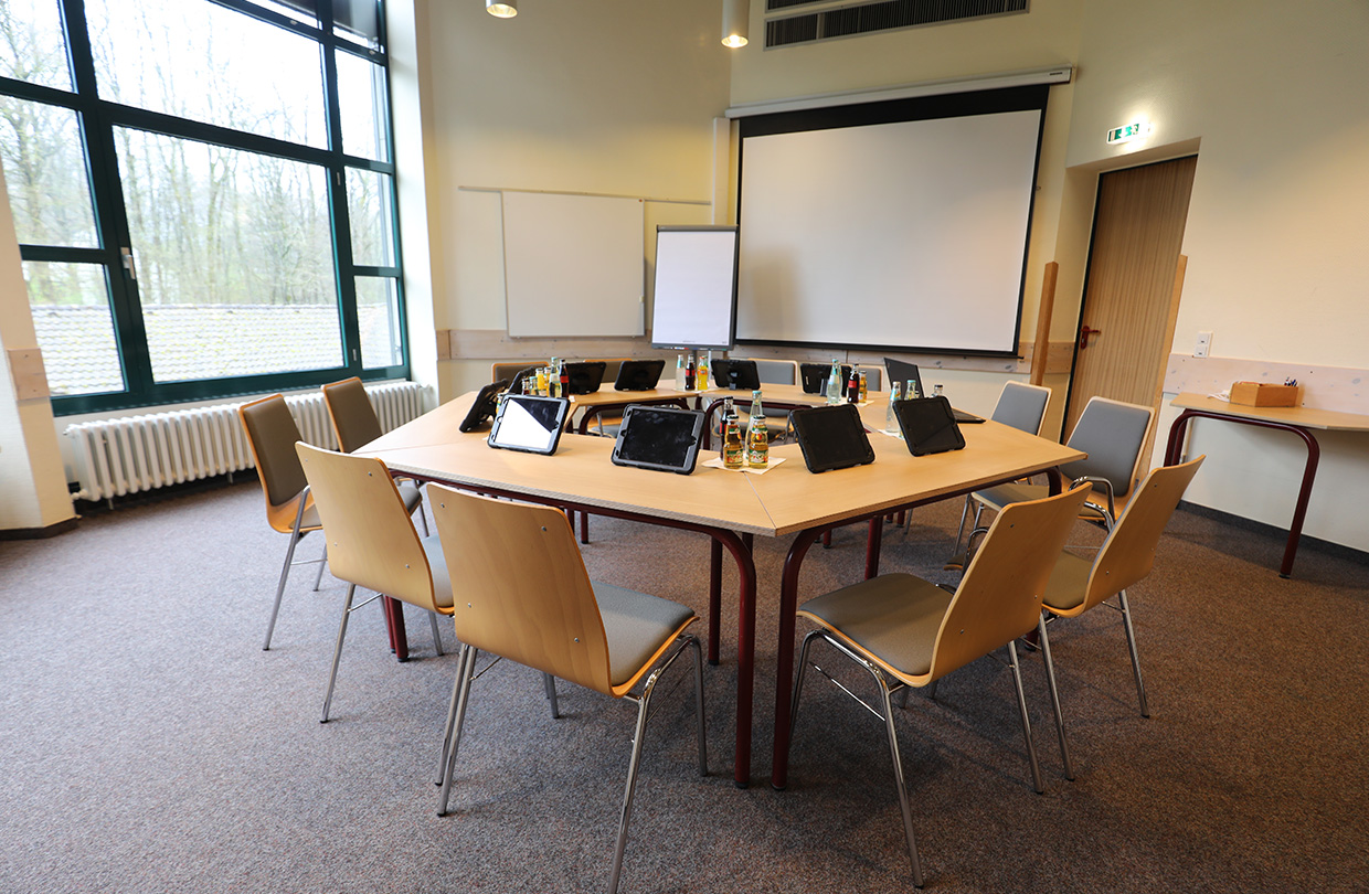 Zur Standardausrüstung jedes Raumes gehören Flip-Chart und Wandtafeln, bewegliche Pinnwände sowie in den großen Räumen ein fest installierter Beamer.